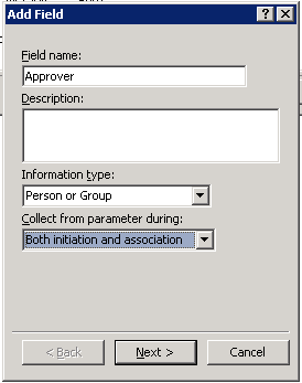 The below dialog enables to set what form parameters appear on either the association, initiation or both forms. Also default values can be set.