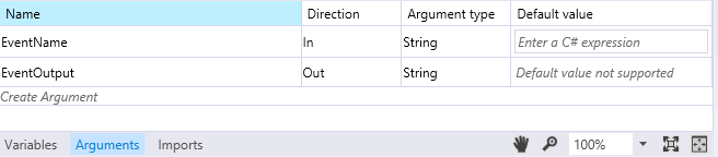 6. Create arguments to make the design of this custom workflow activity dynamic and reusable in Sharepoint Designer workflows. At the bottom of the designer surface, click on the Arguments tab.WaitForCustomEvent 7