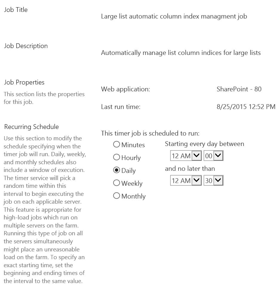 After running this timer job, I went to the List Settings > Indexed columns and haven’t noticed any indexed columns. Perhaps the “indexing” can be seen elsewhere. I will have to continue to investigate.