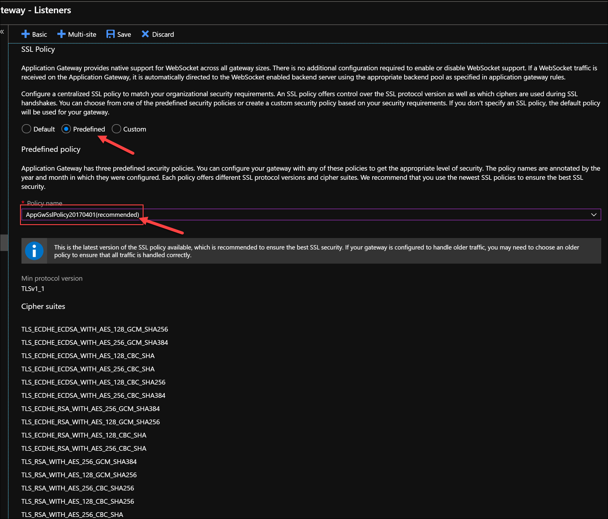 “An SSL policy offers control over the SSL protocol version as well as which ciphers are used during SSL handshakes. You can choose from one of the predefined security policies or create a custom security policy based on your security requirements. If you don’t specify an SSL policy, the default policy will be used for your gateway.” – as displayed in Azure Portal