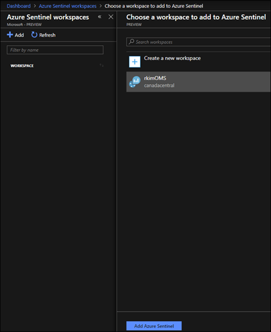 To setup Azure Sentinel, you need to add a log analytics workspace. In my case, I have an existing log analytics workspace, called rkimOMS, that is already configured to collect diagnostic data from an existing application gateway.