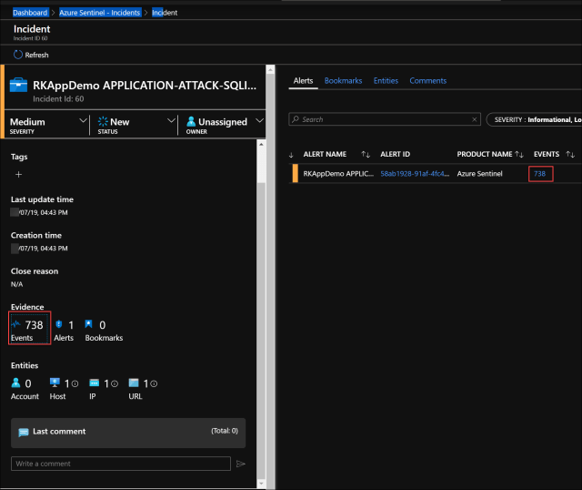 The View full details shows 738 events and other details to help triage and understand in the incident.