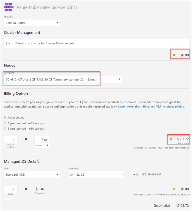 Here is an example of AKS pricing (CAD$) for a 1 node VM cluster in Canada Central region: