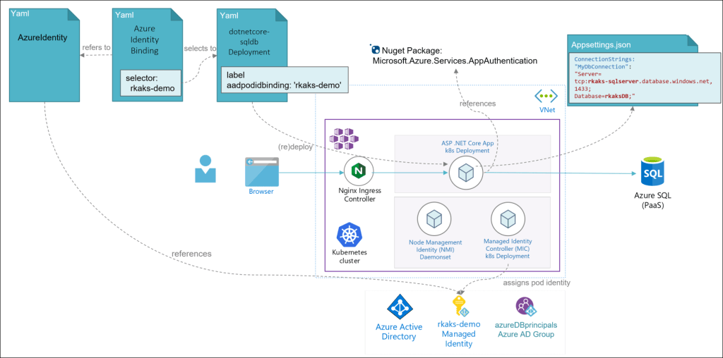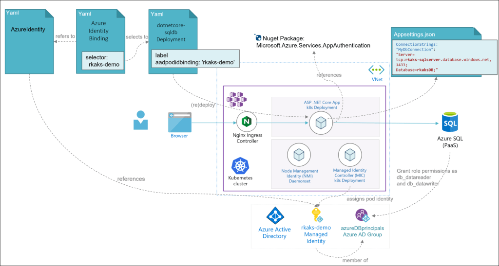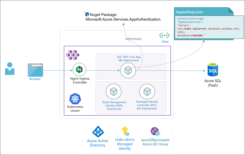 Objective: An ASP .NET Core app hosted in Azure Kubernetes Service (AKS) that is accessing an Azure SQL Database using Azure AD Managed Identity.