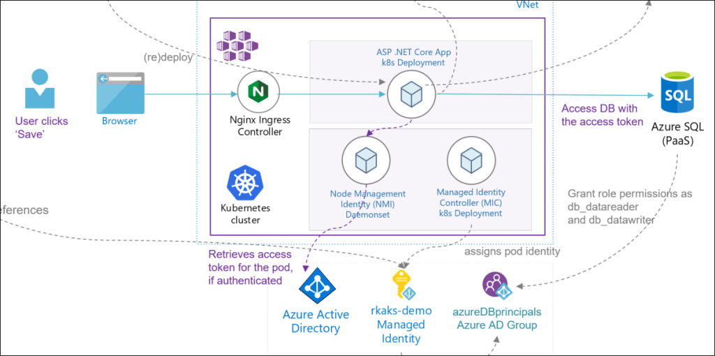 Here the user click’s ‘save’, the application’s pod requires an access token from Azure AD to establish a SQL connection. The NMI effectively retrieves the access token upon successful authentication from Azure AD. There is a lot more behind the scenes retrieve the access token and can be read more at Using Managed Service Identity (MSI) to authenticate on Azure SQL DB and at Best practices for authentication and authorization in Azure Kubernetes Service (AKS)