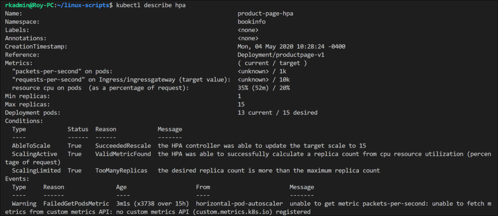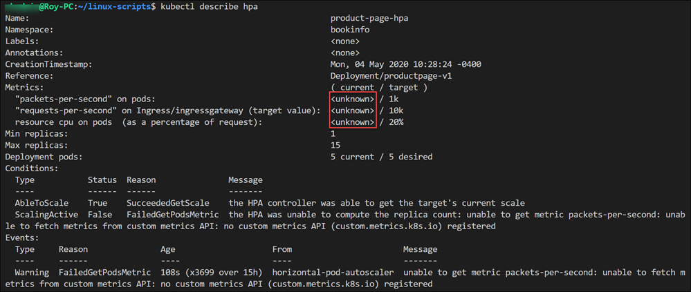 Warning FailedGetPodsMetric 3m46s (x3719 over 15h) horizontal-pod-autoscaler unable to get metric packets-per-second: unable to fetch metrics from custom metrics API: no custom metrics API (custom.metrics.k8s.io) registered