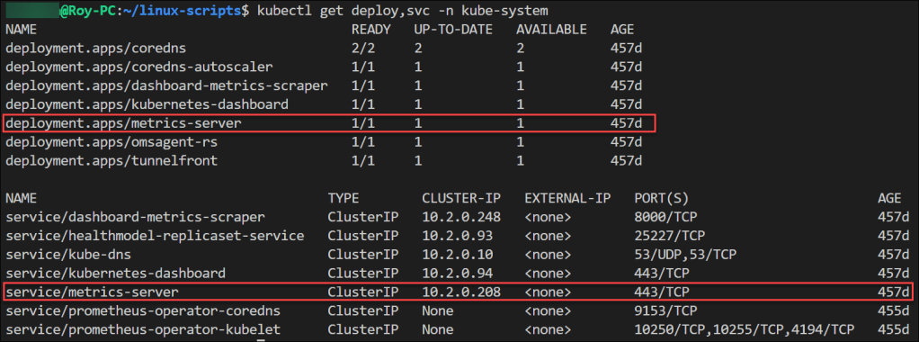 kubectl get deploy,svc -n kube-system | egrep metrics-server