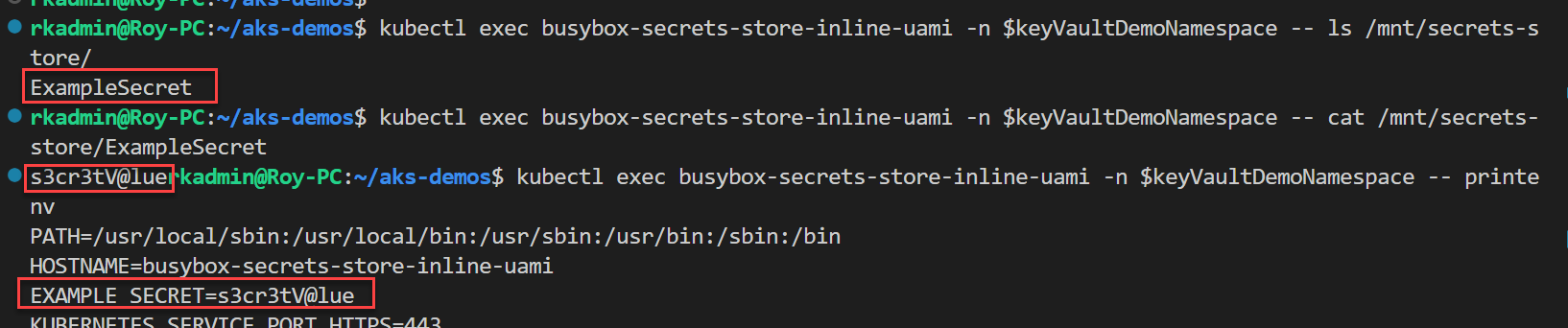 kubectl exec busybox-secrets-store-inline-uami -n $keyVaultDemoNamespace -- cat /mnt/secrets-store/ExampleSecret