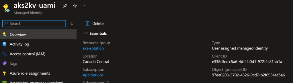 export identityResourceId=$(az identity show -g $rgName -n $aks2kvUserassignedidentityname --query id -o tsv)