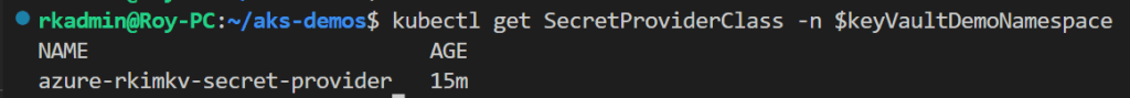 7) Create the SecretProvider Class in your Kubernetes namespace. This is to interface with the given Azure Key Vault and the secret to mount.