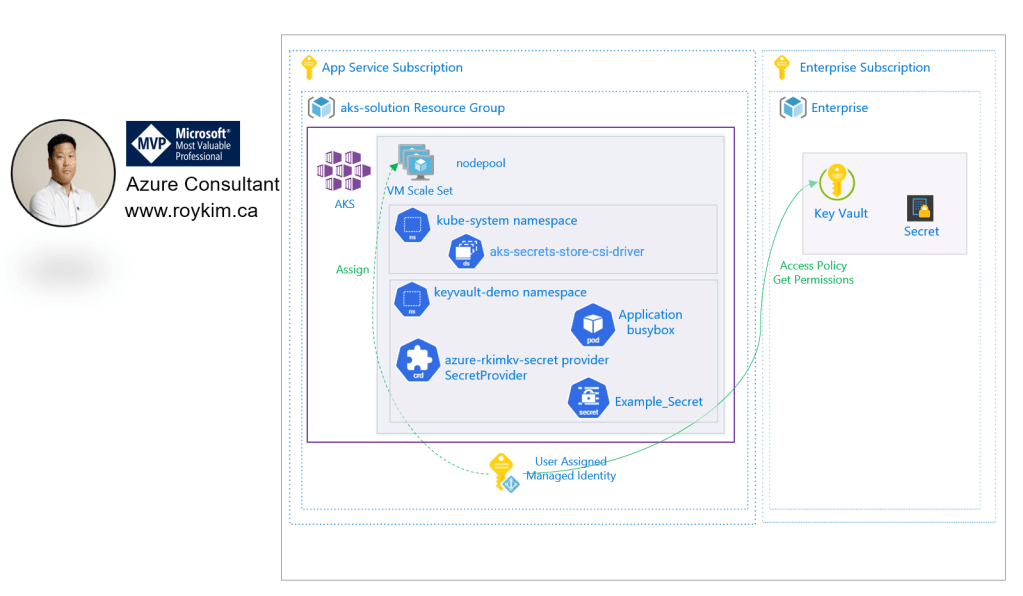 - An existing Azure Key Vault (in a different resource group and subscription than the AKS cluster)