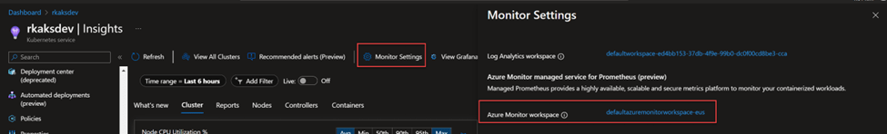 Setting up Prometheus is super easy and you just have to go to Monitor Settings and click through the prompts to enable Prometheus. This will create an Azure Monitor workspace.