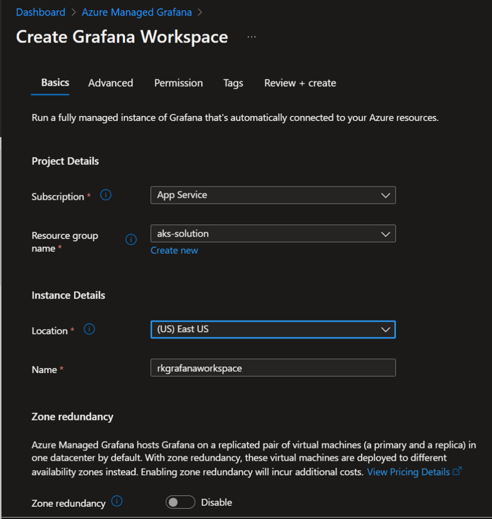 Therefore, one has to be created and let’s search in Azure Portal for Azure Managed Grafana and create a new resource.