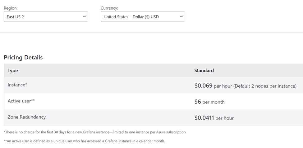 To get an idea of pricing you can find at the azure pricing page https://azure.microsoft.com/en-us/pricing/details/managed-grafana/