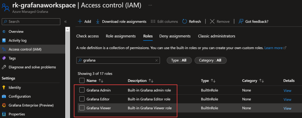 2. Access Management. Managed Grafana leverages Azure AD for access management. The RBAC roles available are as follows