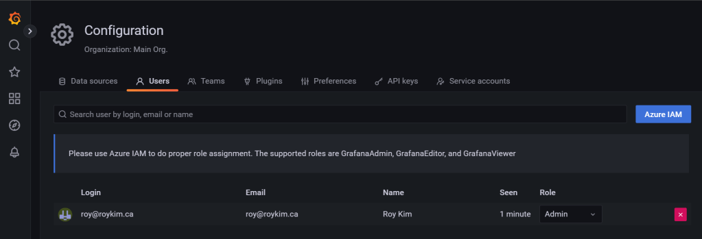 By adding role assignments in Access Control is reflected in the Grafana > Configuration > Users tab. This way it is easy to provide access to your team and customers.