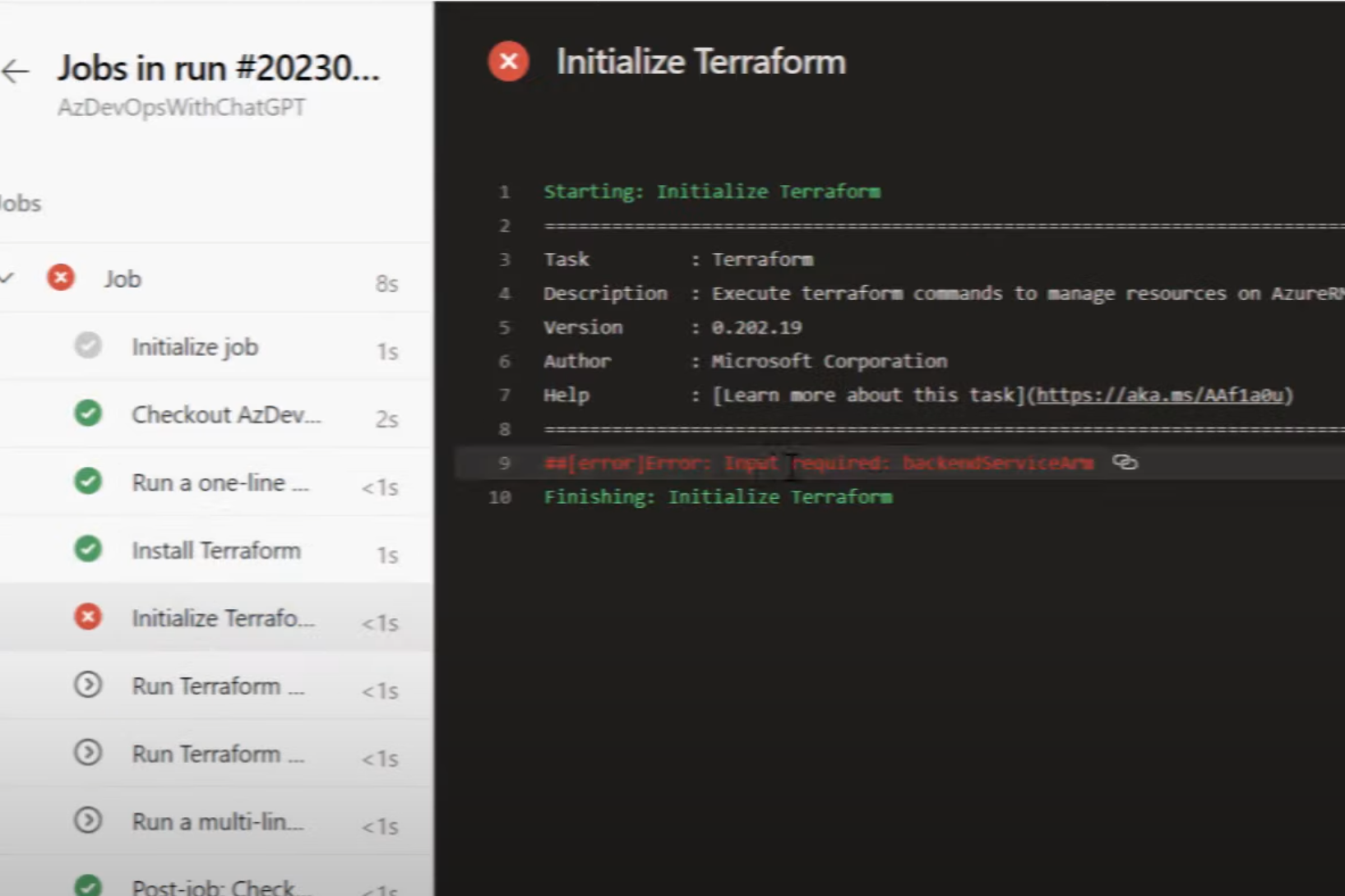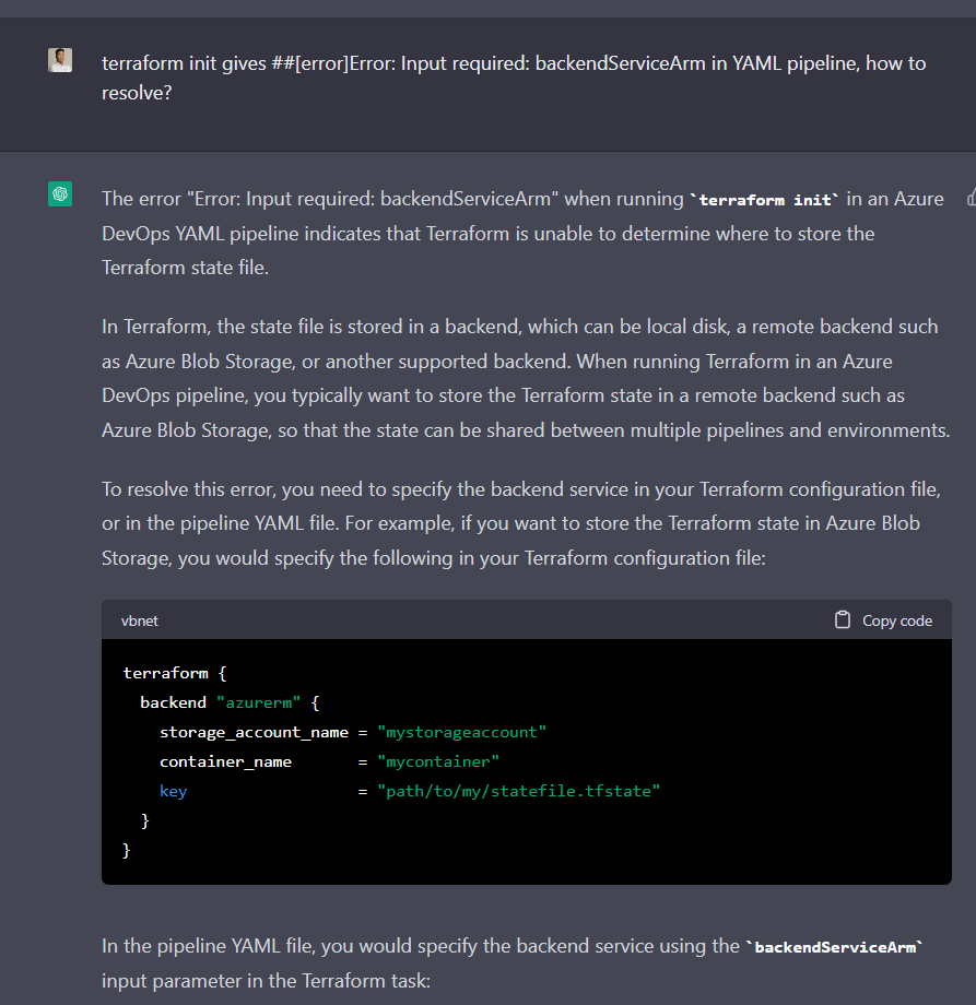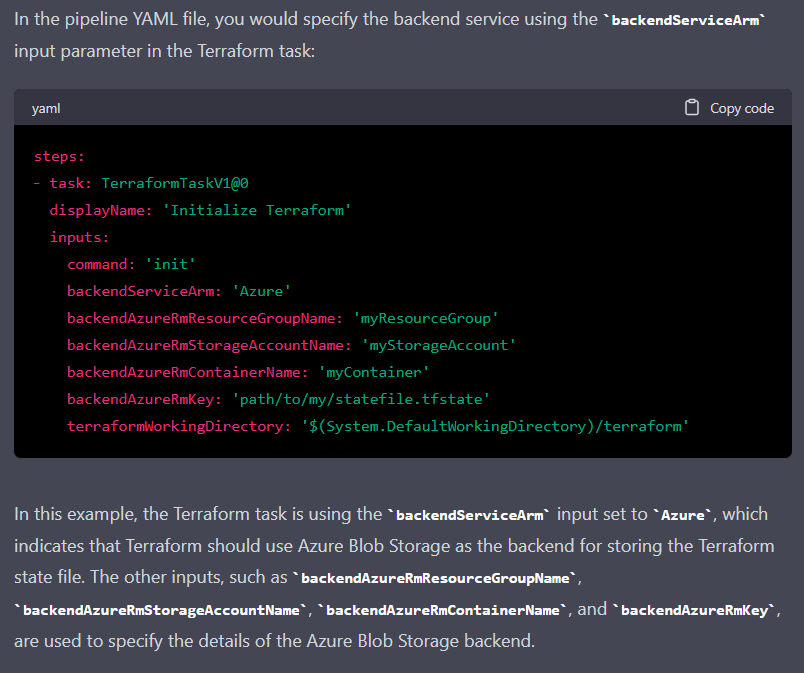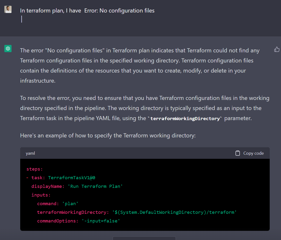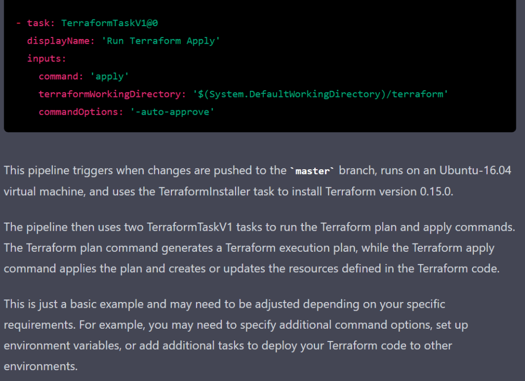 The one downside is that certian syntax such as the parameter names (e.g. terraformWorkingDirectory) was either incompatible or out of date. This makes sense as it is made known that the data that ChatGPT is trained is up until 2021.