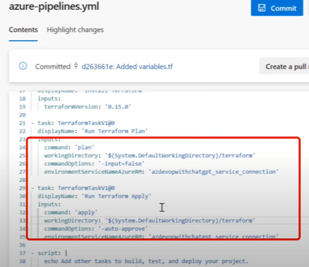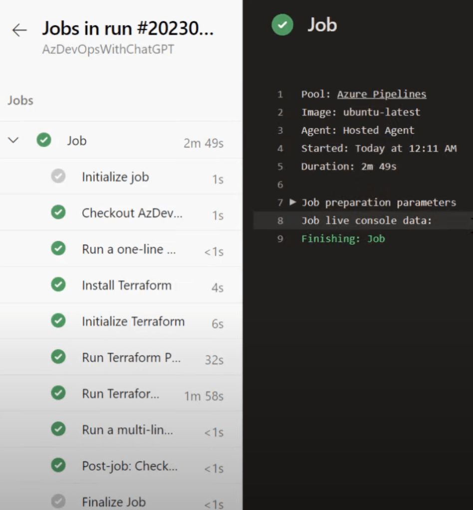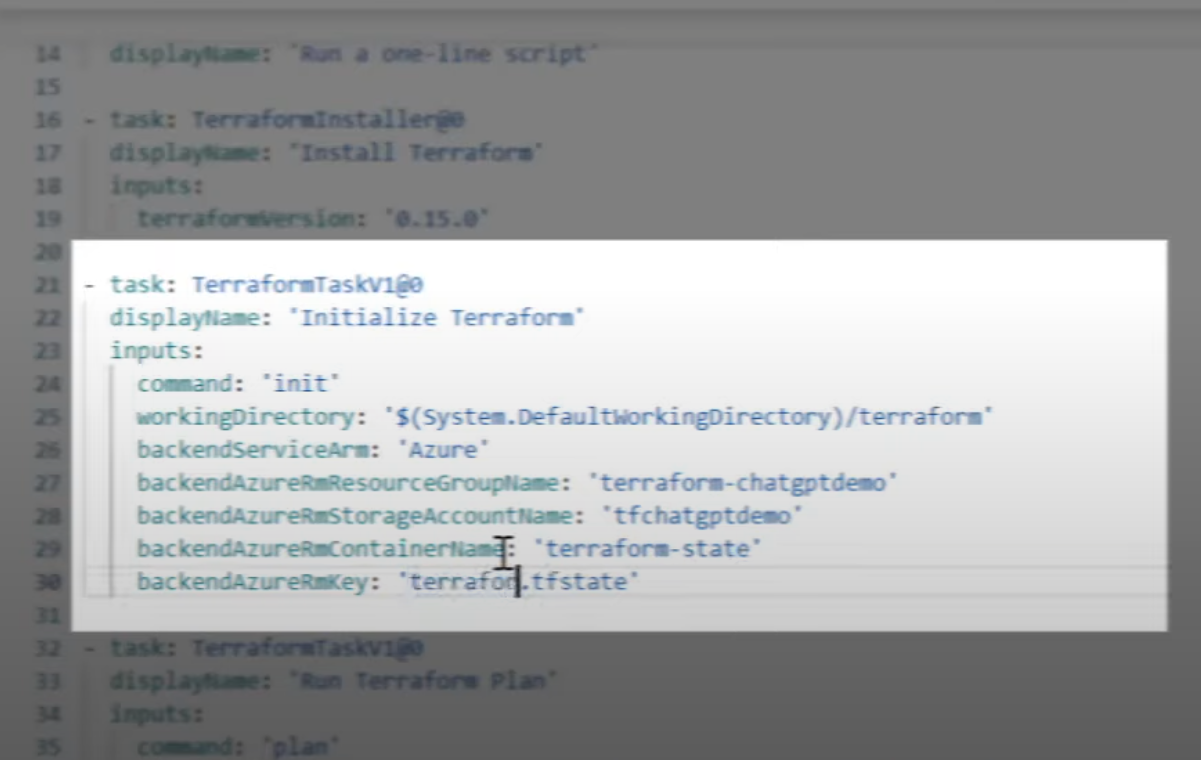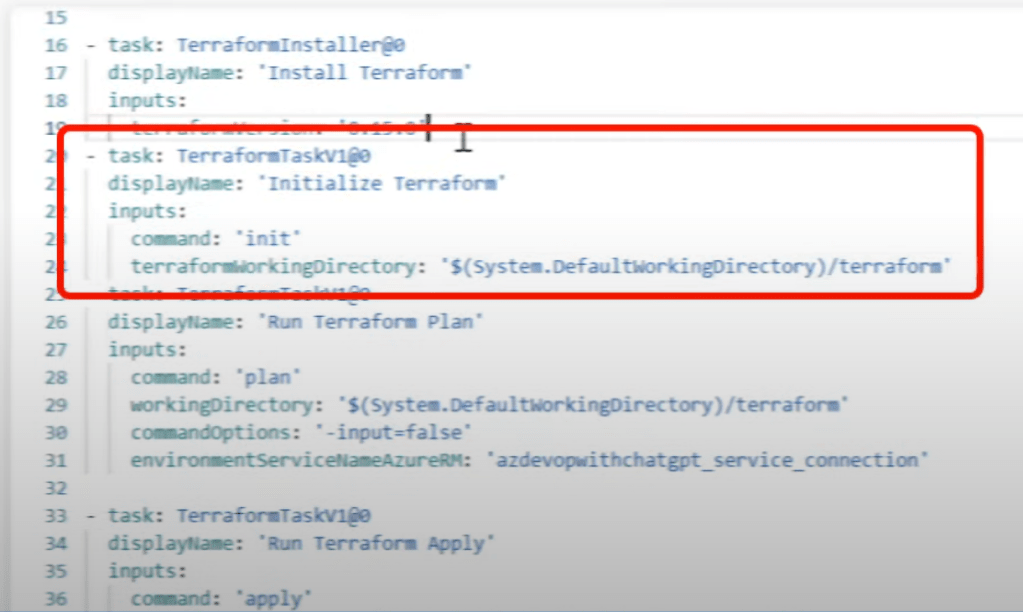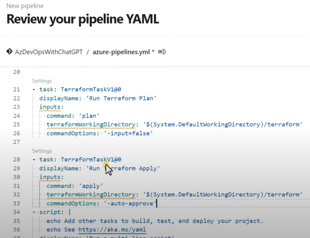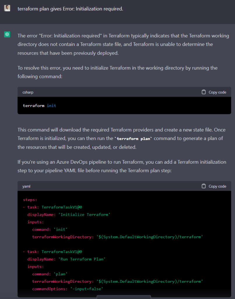 The one downside is that certian syntax such as the parameter names (e.g. terraformWorkingDirectory) was either incompatible or out of date. This makes sense as it is made known that the data that ChatGPT is trained is up until 2021.