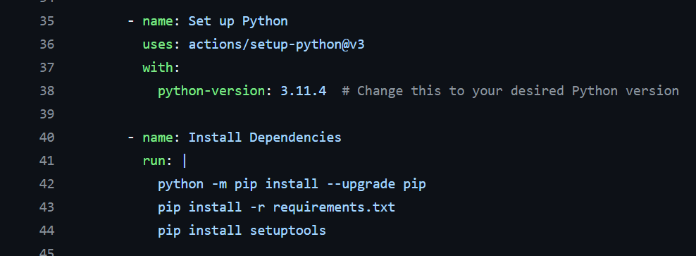 Next step is the Setup Python action to set up a specific version of Python and add the command-line tools to the PATH. Need this for building and using pip python package manager.