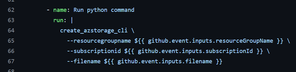 Finally, I run the create_azstorage_cli command and pass in the argument values as the workflow inputs defined earlier.