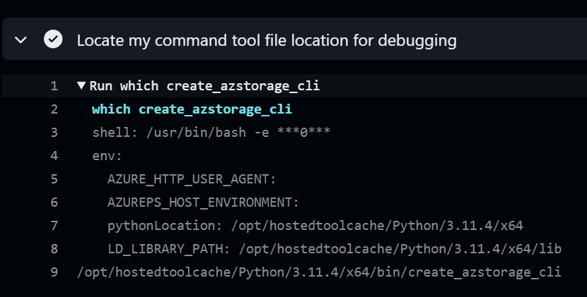 The next 3 steps are for debugging purposes and aren’t required. But it helps to show what the values of the workflow inputs are and see the files in the runner. The linux which command helps identify the location of the command line tool that was built on line 47.