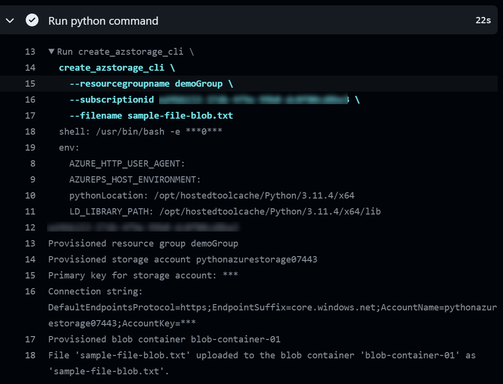 Finally, I run the create_azstorage_cli command and pass in the argument values as the workflow inputs defined earlier.