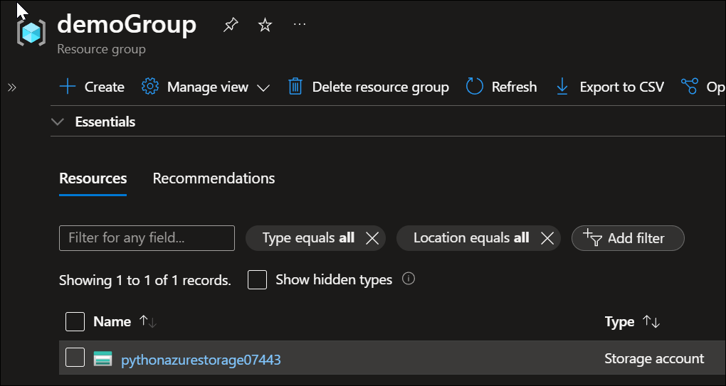 And the final result in the Azure Portal. Resource group with the newly created storage account