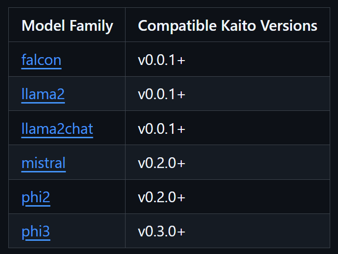 For other Kaito preset configurations of other model families refer to https://github.com/Azure/kaito/blob/main/presets/README.md.