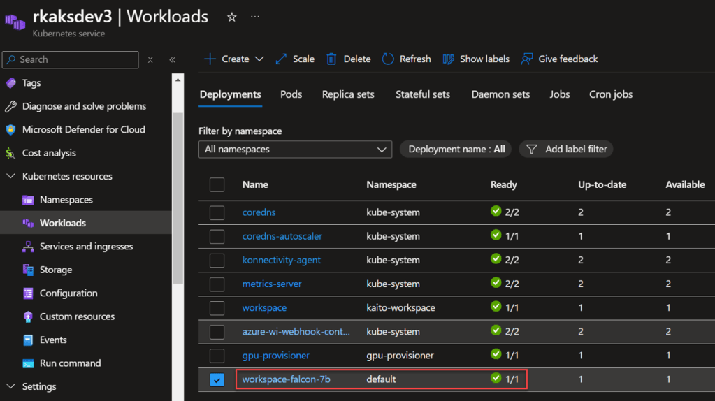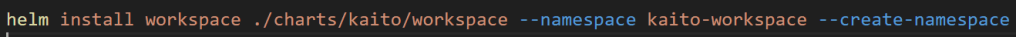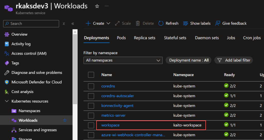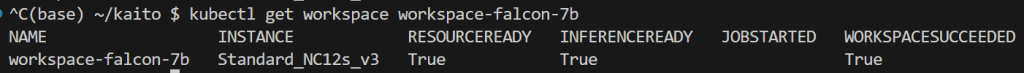 A workspace (controller) deployment resource is created in the kaito-workspace namespace.