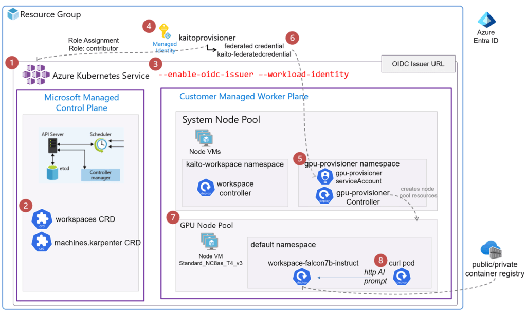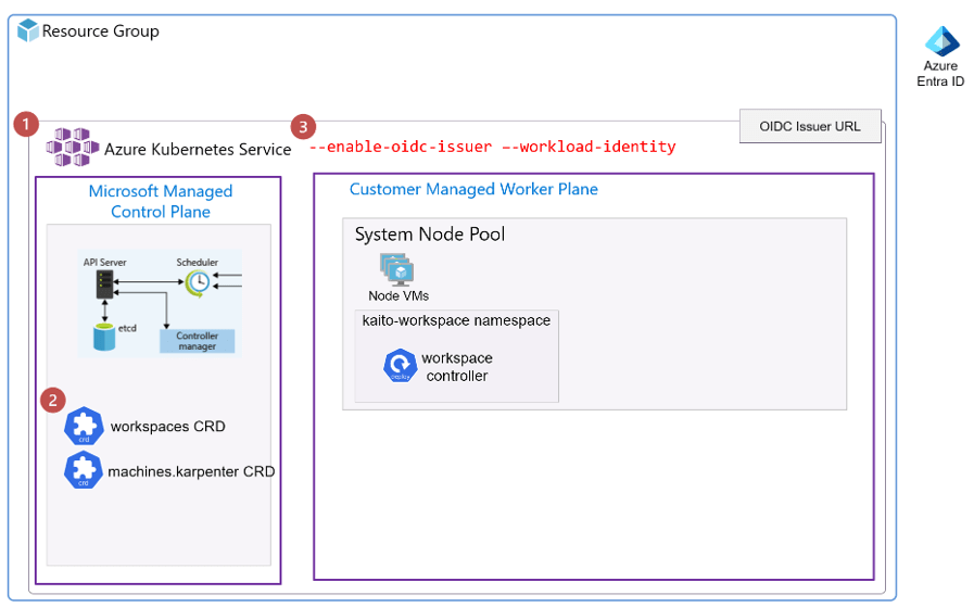 The KAITO design relies on the AKS features of workload identity and OIDC Issuer. These two features allows the Kubernetes workloads such as the Node Provisioner Controller to have the role based access via federated Azure Entra Identity Management to create Azure resources. In this case the AKS node pool Virtual machines. Workload Identity removes the need for secrets (like passwords or tokens) within Kubernetes by leveraging the native authentication of Azure Entra.