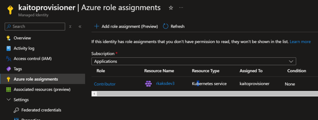 To verify in the kaitoprovisioner managed identity, go to Federated credentials settings.