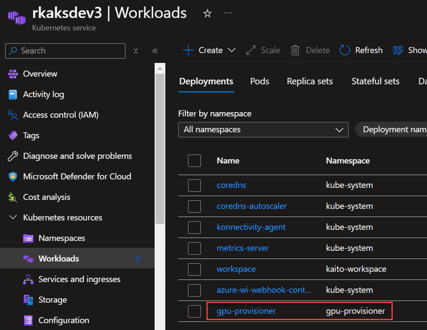 You can see the gpu-provisioner controller deployment in the new gpu-provisioner namespace.