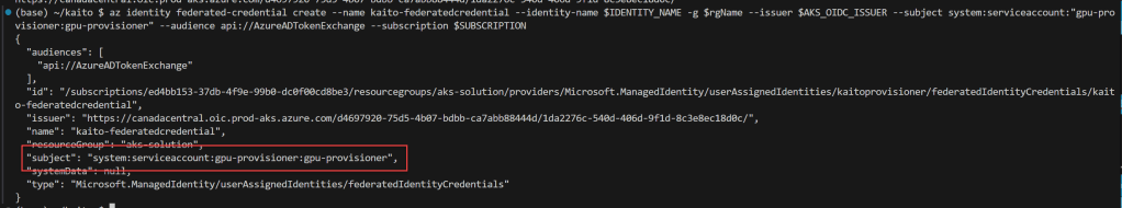 The az identity federated-credential cmd makes reference of the subject to the gpu-provisioner service account created in the previous step.