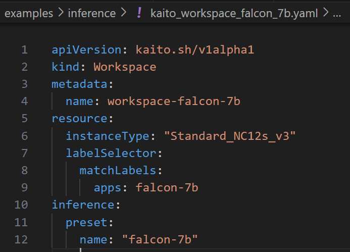 This custom resource Workspace manifests defines the GPU Node VM which is Standard_NC12s_v3. And the LLM model is defined to be falcon-7b.