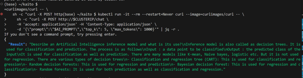 To do a simple test, create a curlimage pod to make an http call against the the workspace-falcon-7b inference service cluster IP.