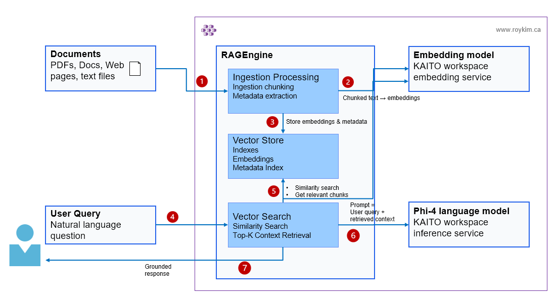 KAITO RagEngine packages that plumbing into a Kubernetes-native experience. You define a RAGEngine custom resource (CRD), point it at an existing inference endpoint (e.g. Phi-4 model), choose an embedding strategy (local or remote), and you get a service that can index documents and answer questions against those documents.