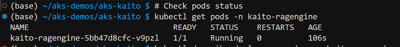 Verify pod status in kaito-ragengine namespace