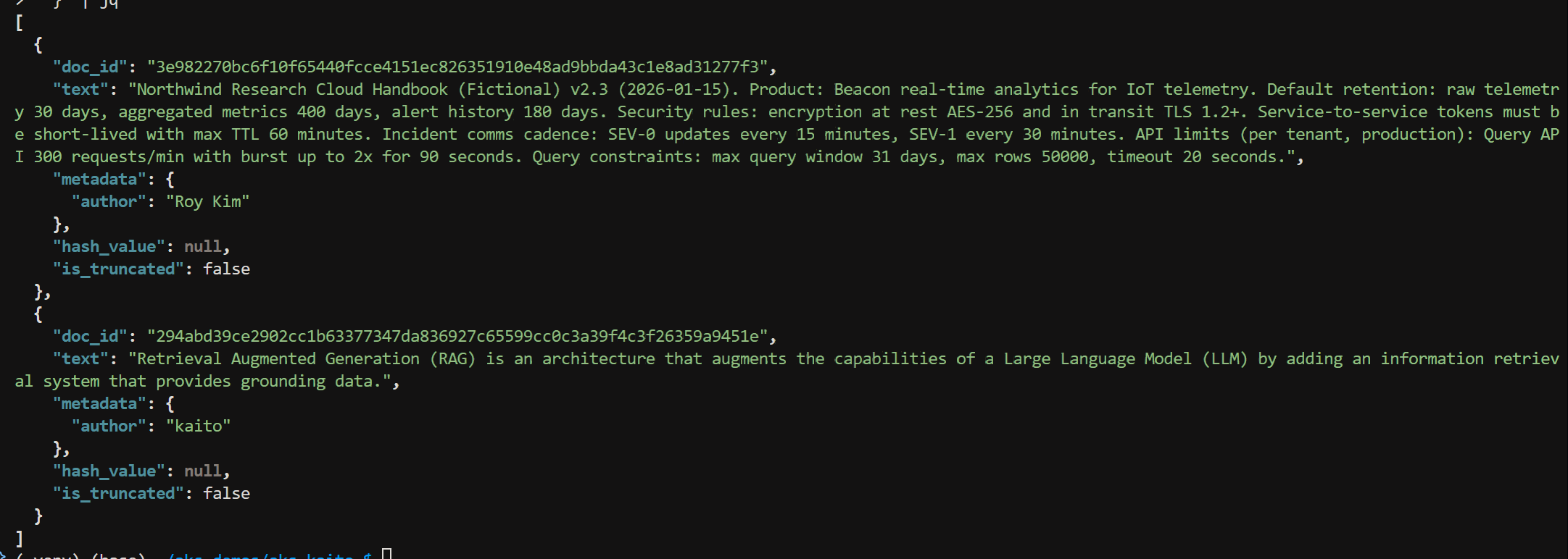 RAG_PATH="rag-nostorage"curl -sS -X POST "http://$INGRESS_IP/$RAG_PATH/index" \ -H "Content-Type: application/json" \ -d '{ "index_name": "rag_index", "documents": [ { "text": "Northwind Research Cloud Handbook (Fictional) v2.3 (2026-01-15). Product: Beacon real-time analytics for IoT telemetry. Default retention: raw telemetry 30 days, aggregated metrics 400 days, alert history 180 days. Security rules: encryption at rest AES-256 and in transit TLS 1.2+. Service-to-service tokens must be short-lived with max TTL 60 minutes. Incident comms cadence: SEV-0 updates every 15 minutes, SEV-1 every 30 minutes. API limits (per tenant, production): Query API 300 requests/min with burst up to 2x for 90 seconds. Query constraints: max query window 31 days, max rows 50000, timeout 20 seconds.", "metadata": { "author": "Roy Kim" } }, { "text": "Retrieval Augmented Generation (RAG) is an architecture that augments the capabilities of a Large Language Model (LLM) by adding an information retrieval system that provides grounding data.", "metadata": { "author": "kaito" } } ] }' | jq