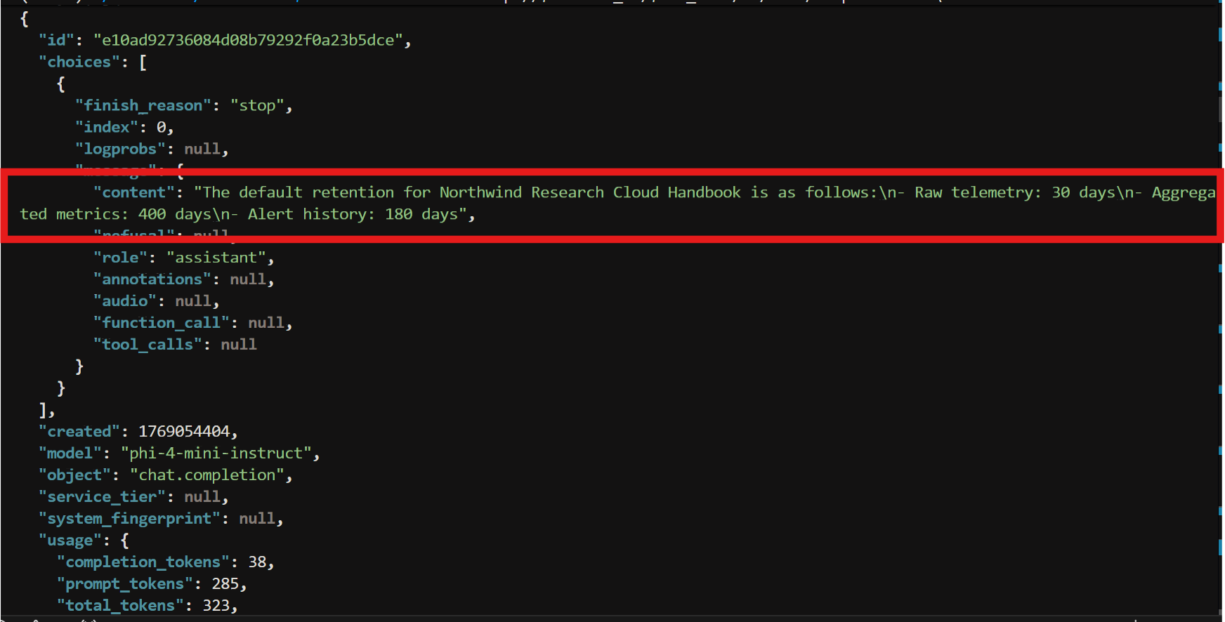 Now to ask a question against the indexed documents via RAG Engine, “What is the default retention for raw telemetry vs aggregated metrics vs alert history? Give the numbers and units.“