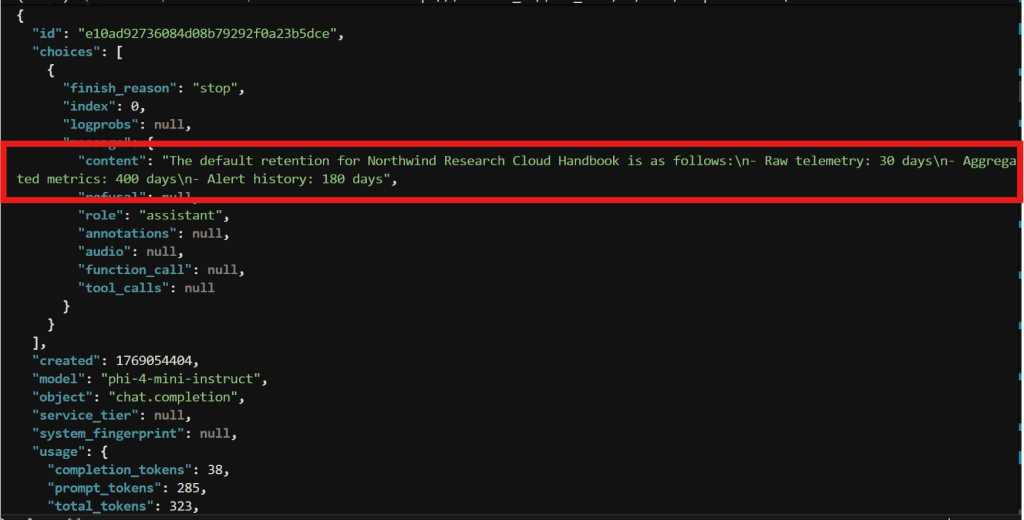 Note that the curl command against the chat completion API is set with the model as phi-4-mini-instruct. This model is used to take the search result(s) and provide a grounded response back to the user.